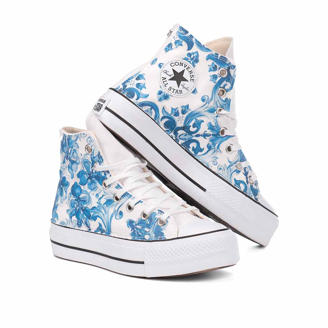Indossa questa versione estiva delle iconiche converse All Star Platform con trama mediterranea per rendere i tuoi outfit ricercati, attuali e distintivi.