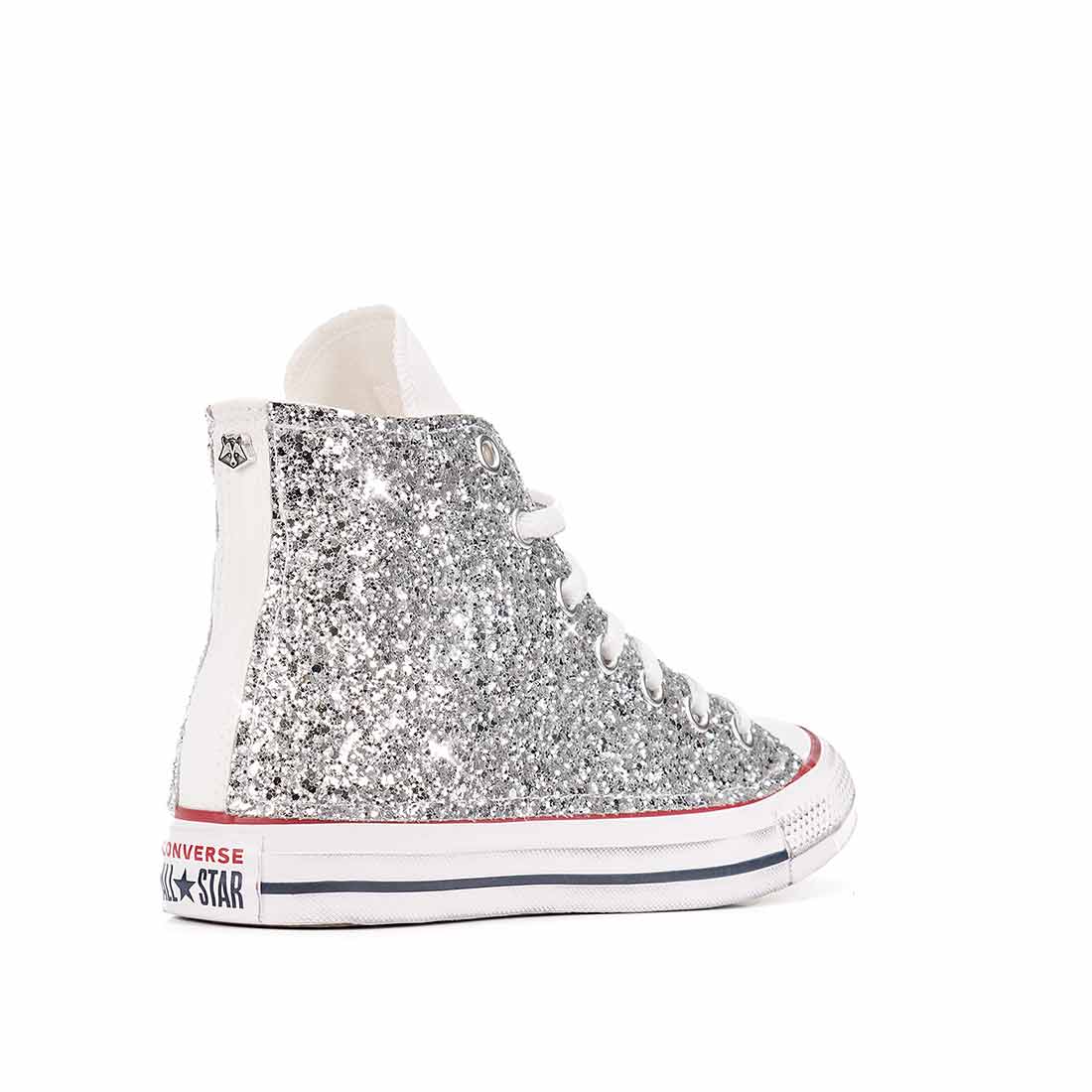 Le scarpe Converse "Chuck Taylor" All Star Alte sono le sneaker più famose al mondo per la loro linea inconfondibile e vengono riproposte qui nella versione con brillantini color argento.