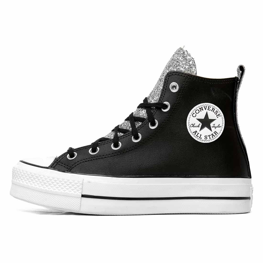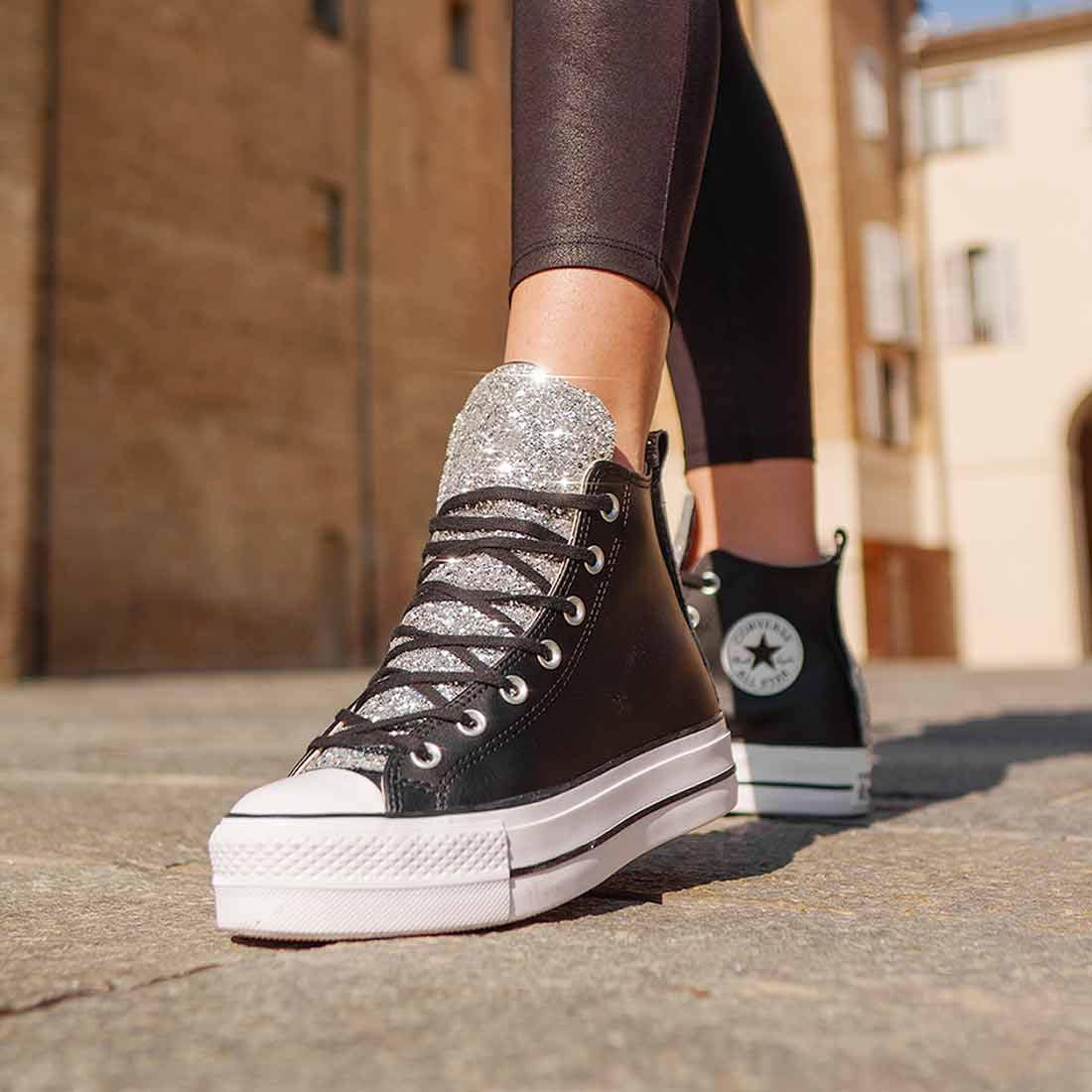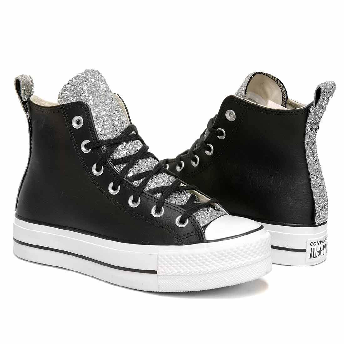 Converse All Star Platform in Pelle Nera con Glitter Argento - Outlet